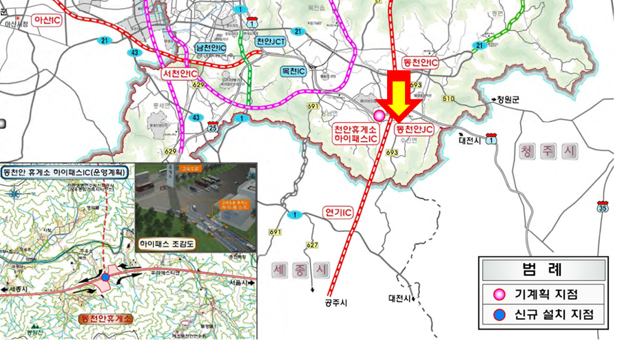 - 세종고속도로 ic개설중(3분), 천안하 휴게소 하이패스(2분) 예정